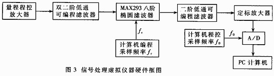 图3为信号处理仪器硬件框图。其中,MAX293及其前后的模拟低通滤波器一起,组成通带可编程抗混滤波器。